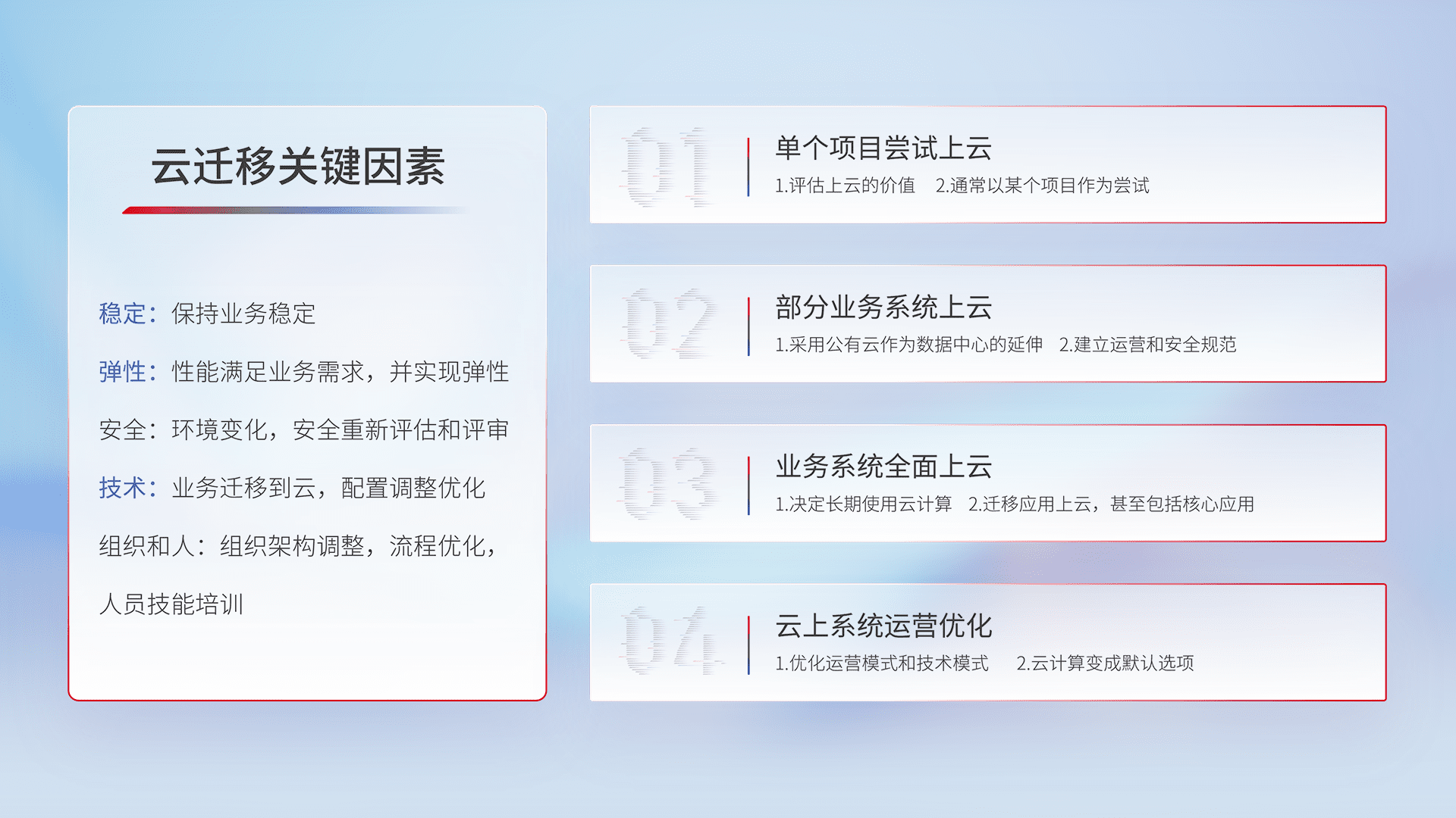 结合实际业务,,从规划设计、、、云平台选型、、、云原生改造、、、、数据迁移、、、、集成交付,,,,迁移全过程为客户识别最佳上云路径,,做好风险识别管理,,设计网络架构、、身份权限、、安全审计合规、、、、操作审计、、、、日志审计、、、监控告警策略、、、、多站点容灾设计等,,对云上基础设施进行整体规划,,提升IT治理水平,,,以满足弹性、、、高可用、、高性能的需求。。