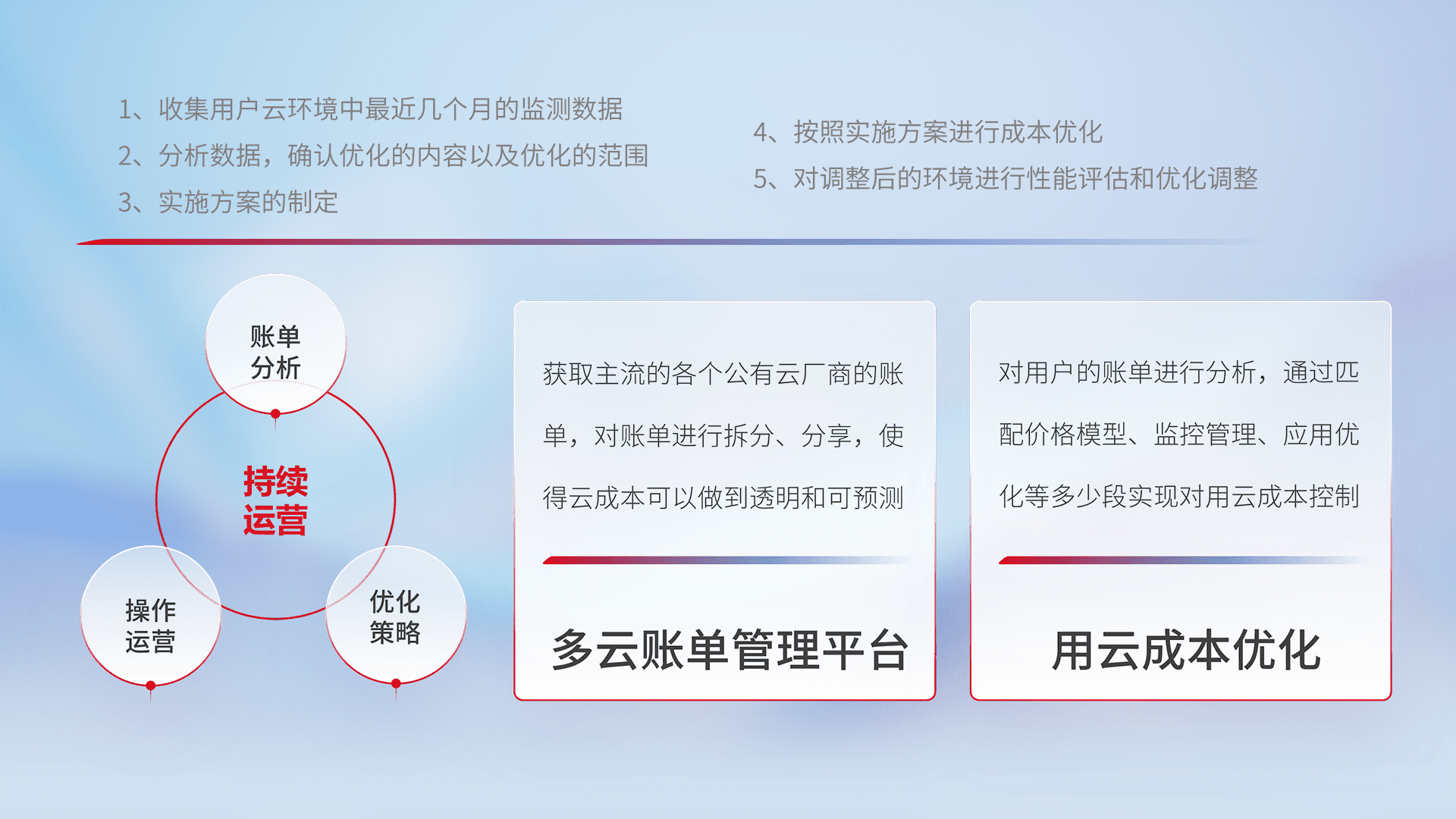 通过多云纳管,,以统一的资源数据模型把客户的云资源进行抽象和封装,,,进而实现对多云资源的统一操作,,,,保障云资源管理的可靠性、、、稳定性与可用性。。。量身定制化运维内容,,,配置、、、、开发运维、、、补丁管理、、、、备份、、、、监控、、认证和访问管理、、审计和日常巡检等,,保障在用云过程中的可靠度,,,稳定度以及高可用率。。